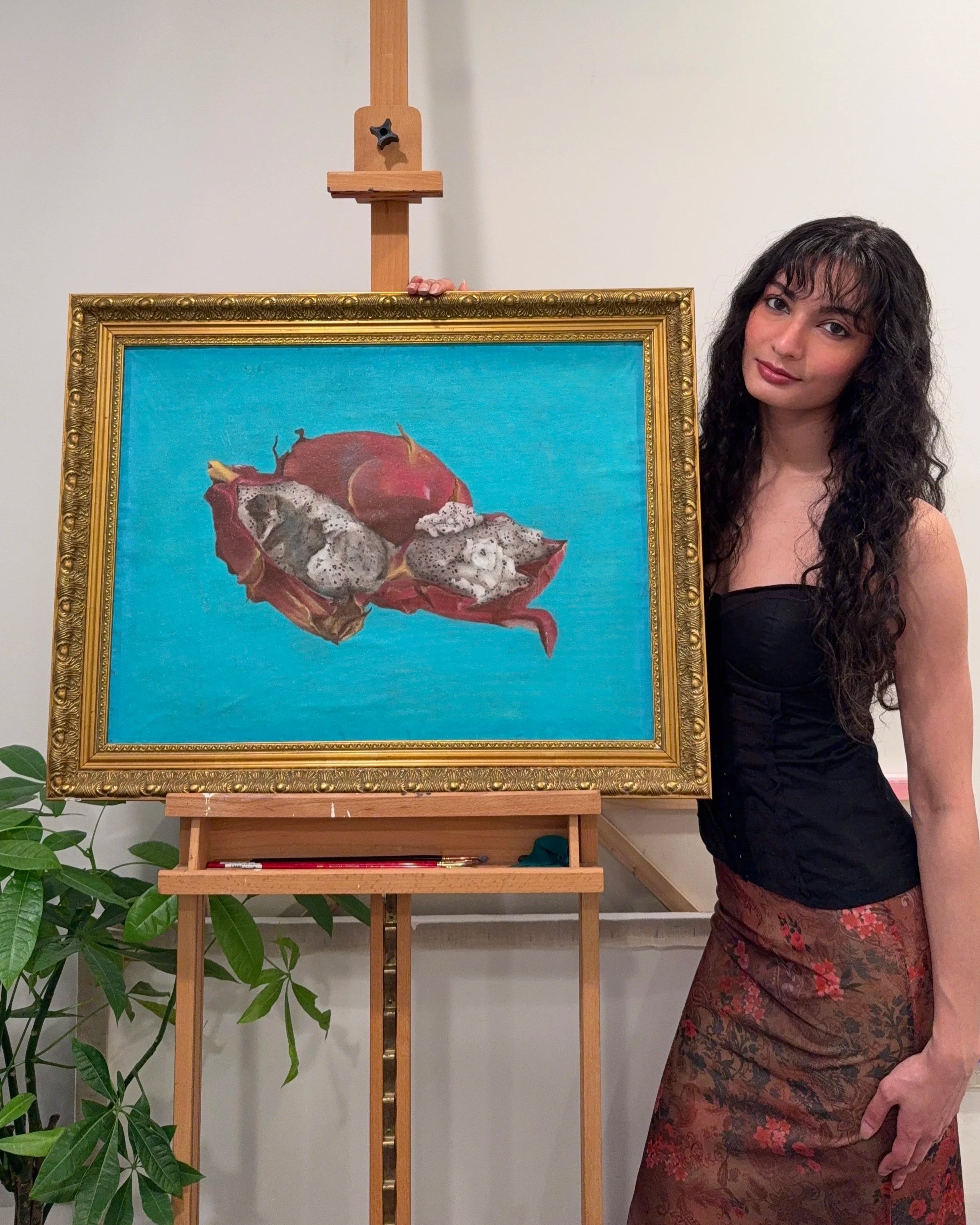 Dalal’s fruit still lives began as studies on the surface focused on saturation, ripeness, and the tension between abundance and decay. She was initially drawn to excess: how color could swell under oil, how flesh could appear on the verge of splitting. Over time, she began to recognize that these objects were not neutral. The fruits she returned to most often — mango, pomegranate, coconut, guava — carried geographies, trade histories, ritual associations, and inherited memory.